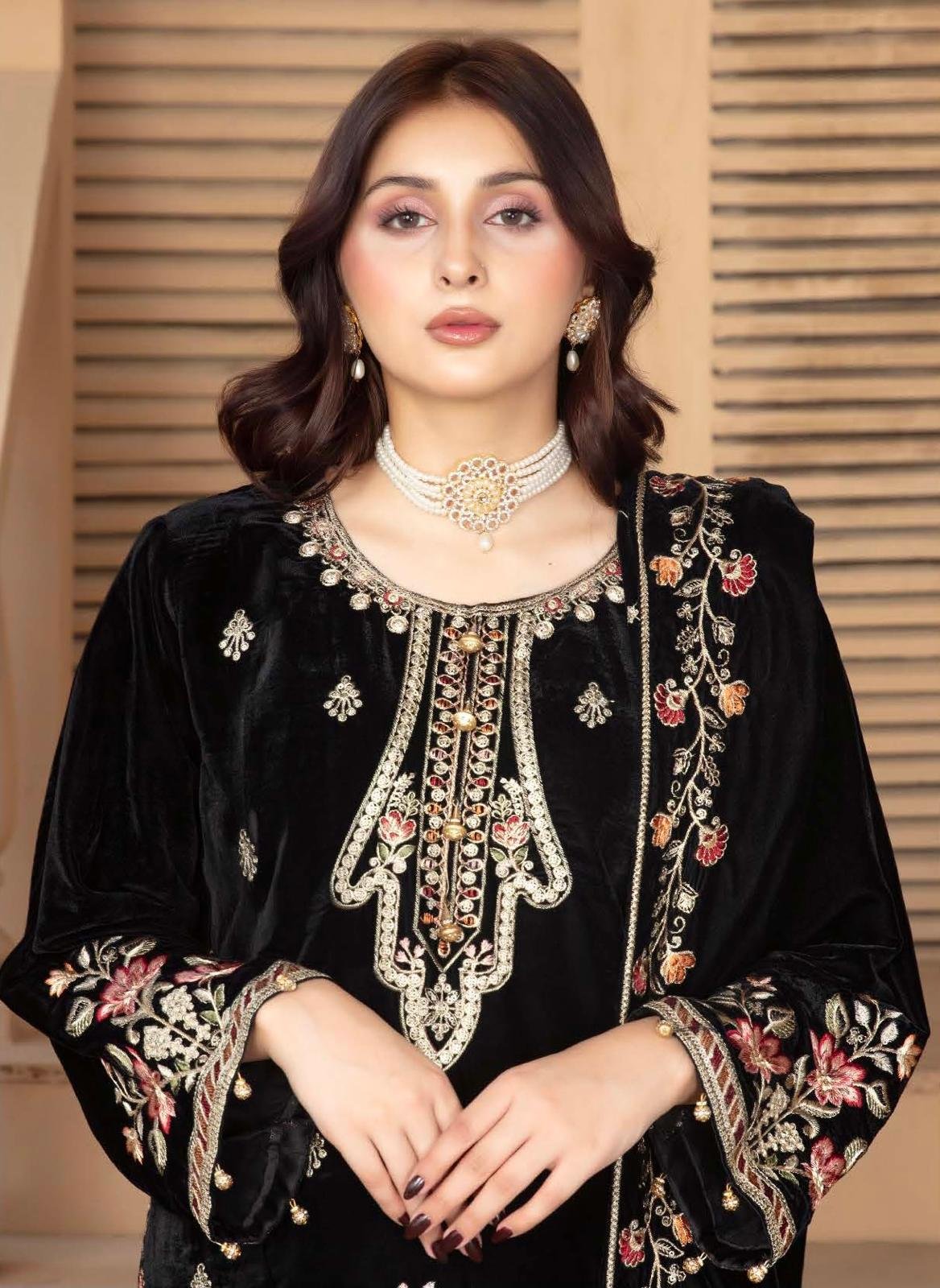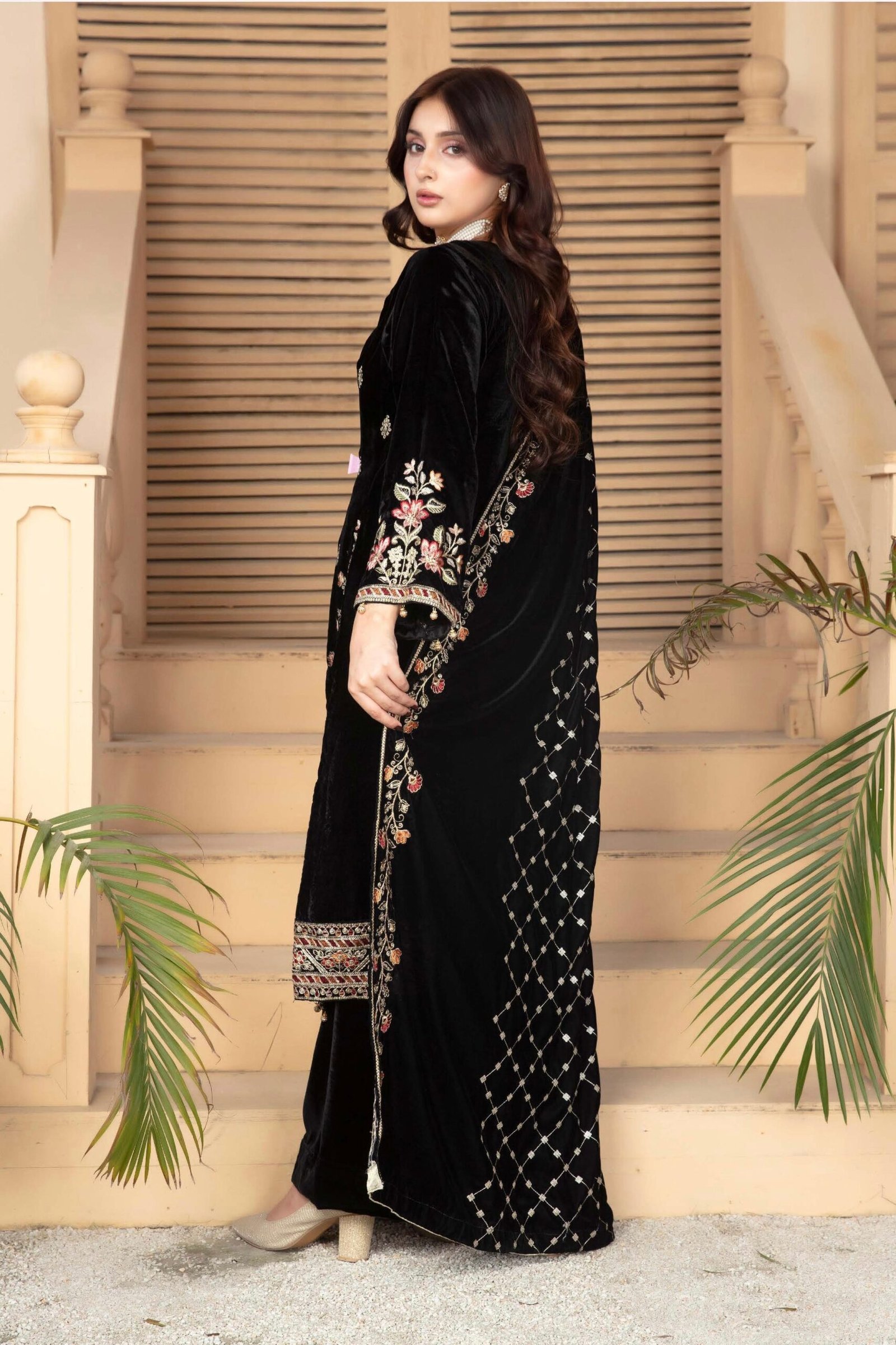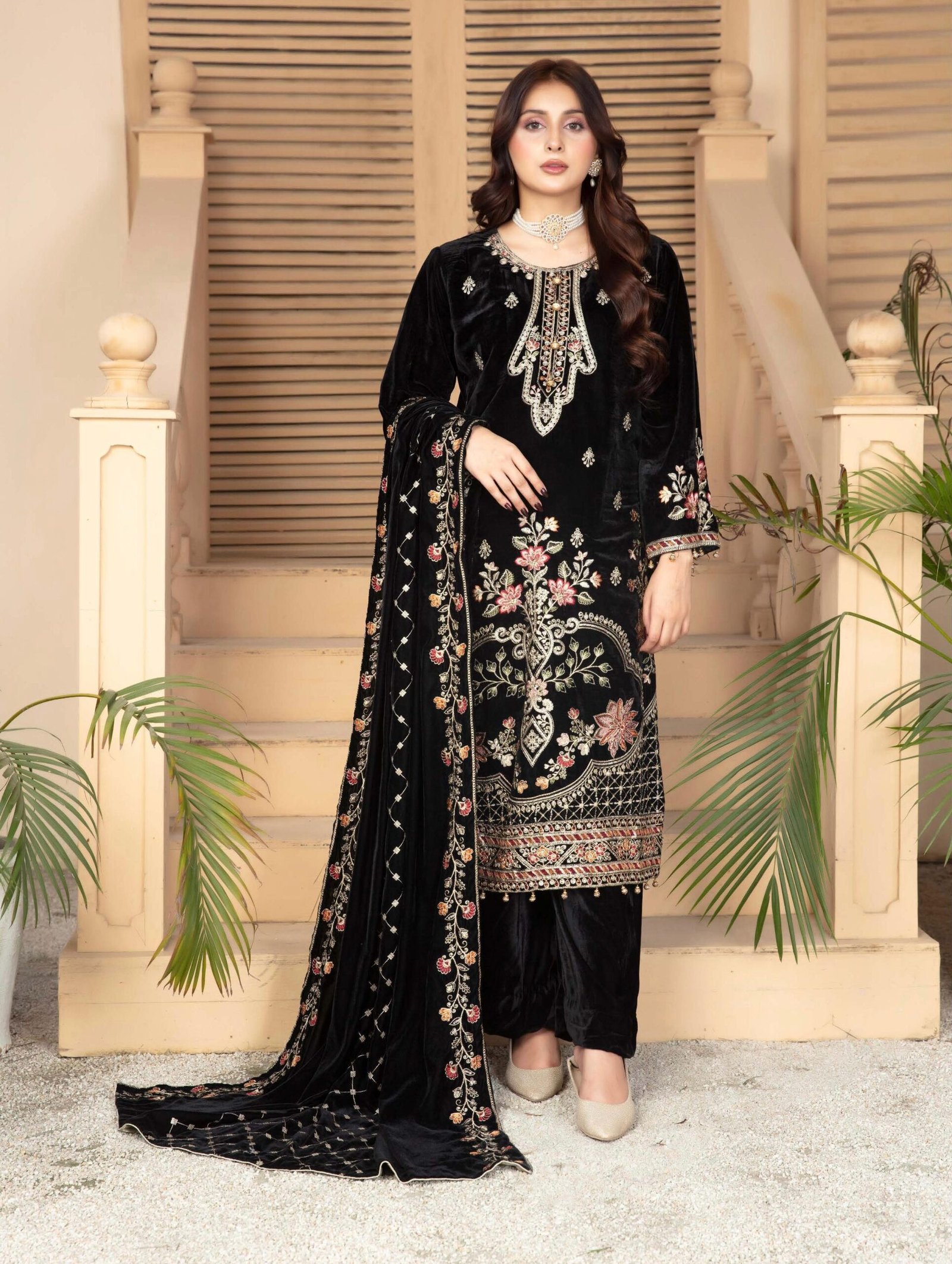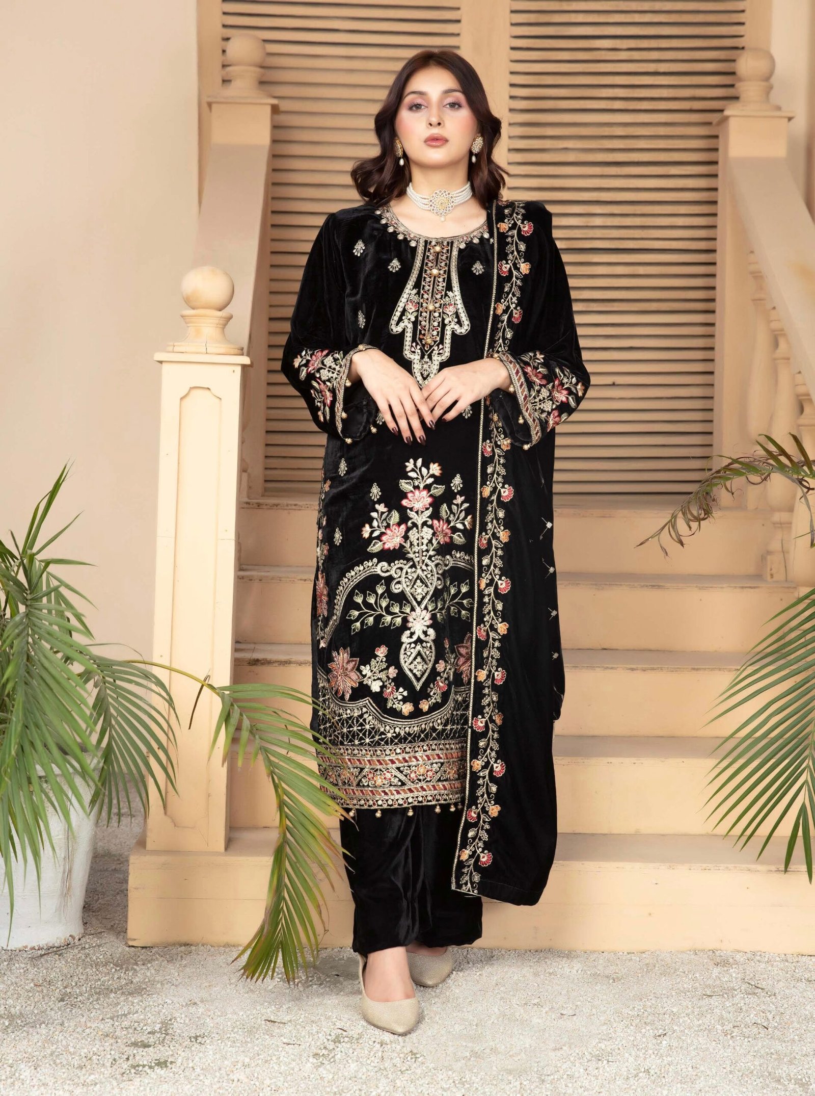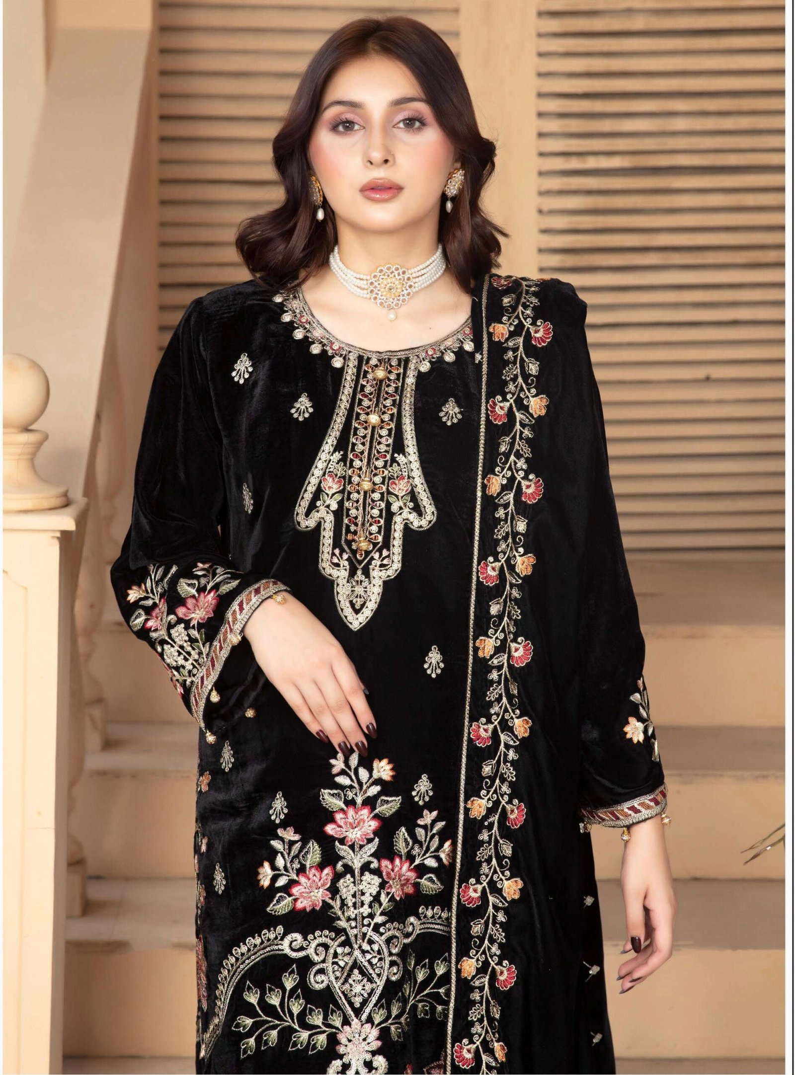 Elevate your festive and formal wardrobe with this luxurious black velvet embroidered ensemble, designed to make you stand out with timeless grace and sophistication. Crafted from plush, premium velvet, this outfit drapes beautifully and brings a royal touch to your look.