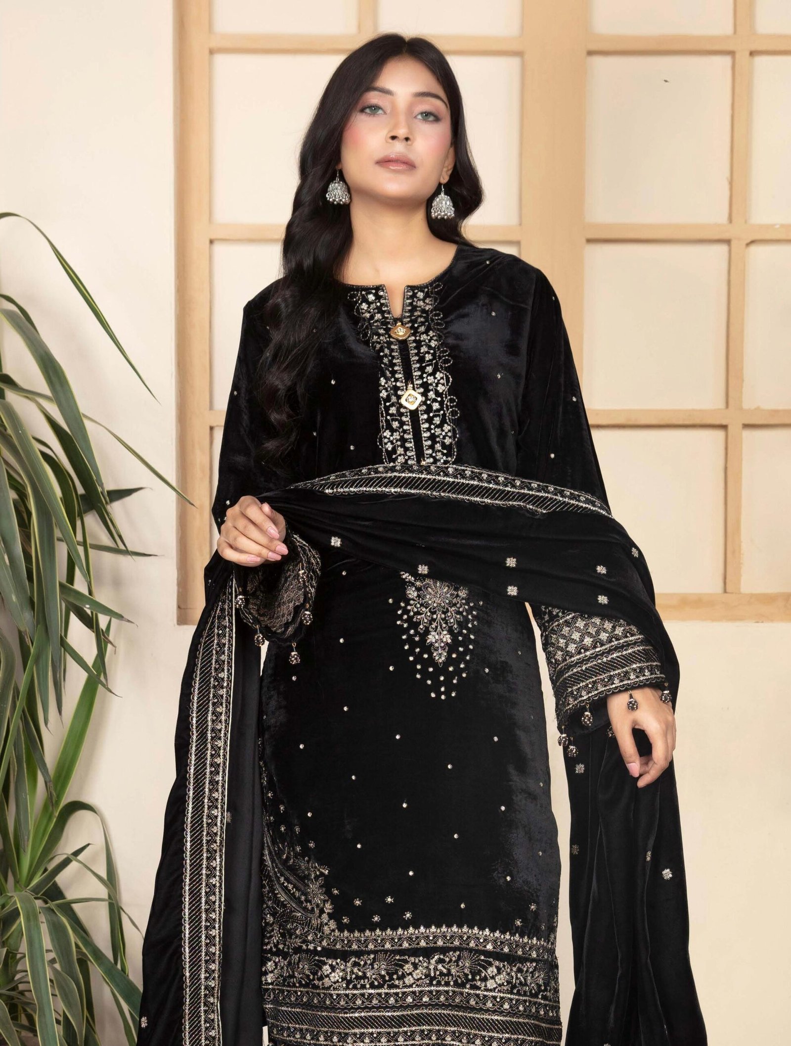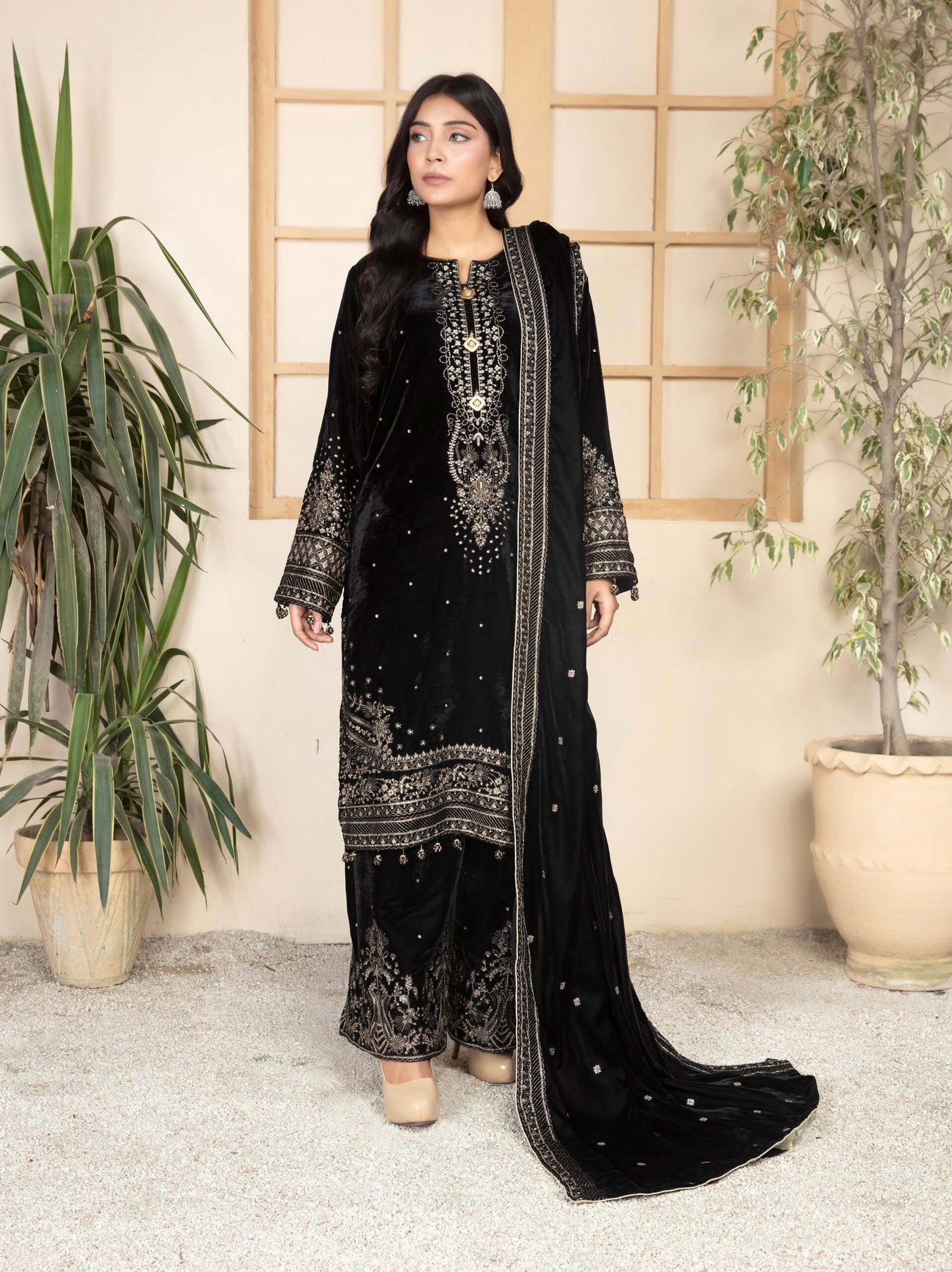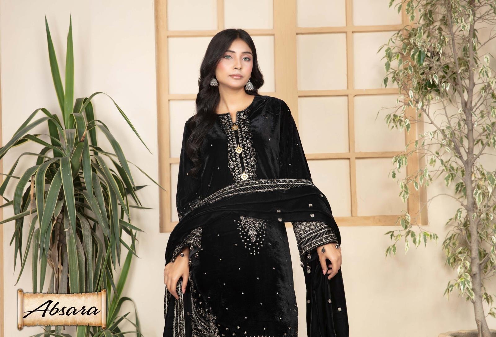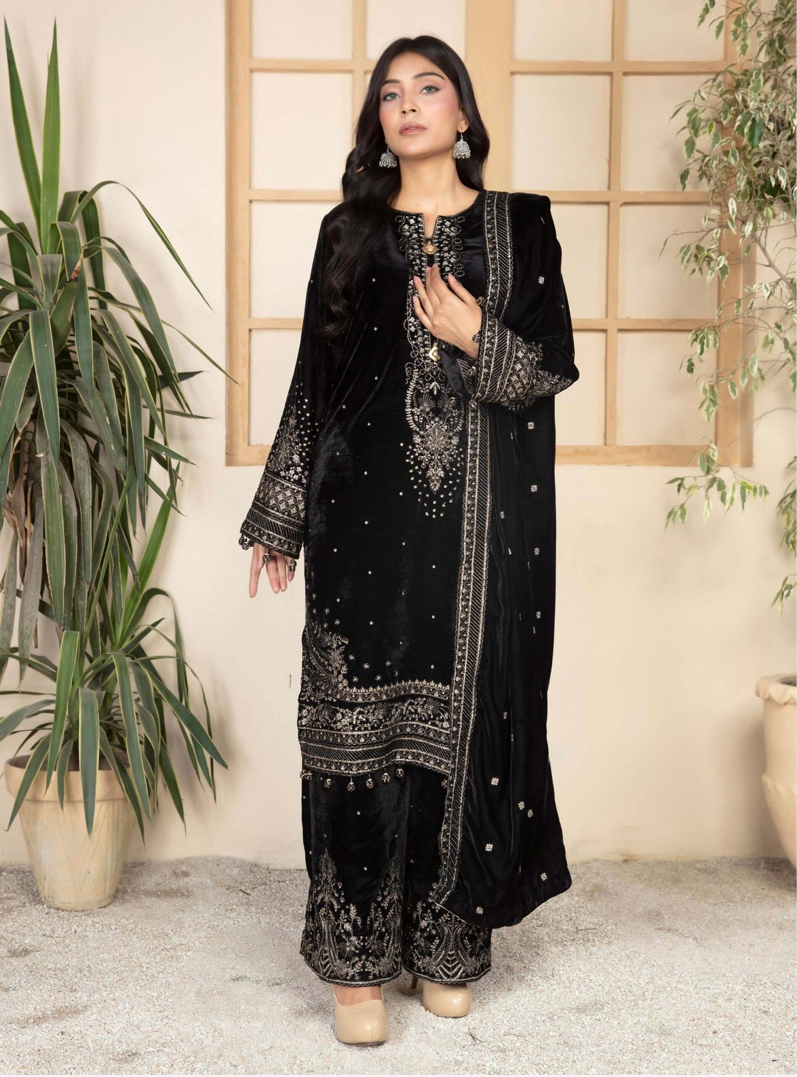 Elevate your festive and formal wardrobe with this luxurious black velvet embroidered ensemble, designed to make you stand out with timeless grace and sophistication. Crafted from plush, premium velvet, this outfit drapes beautifully and brings a royal touch to your look.