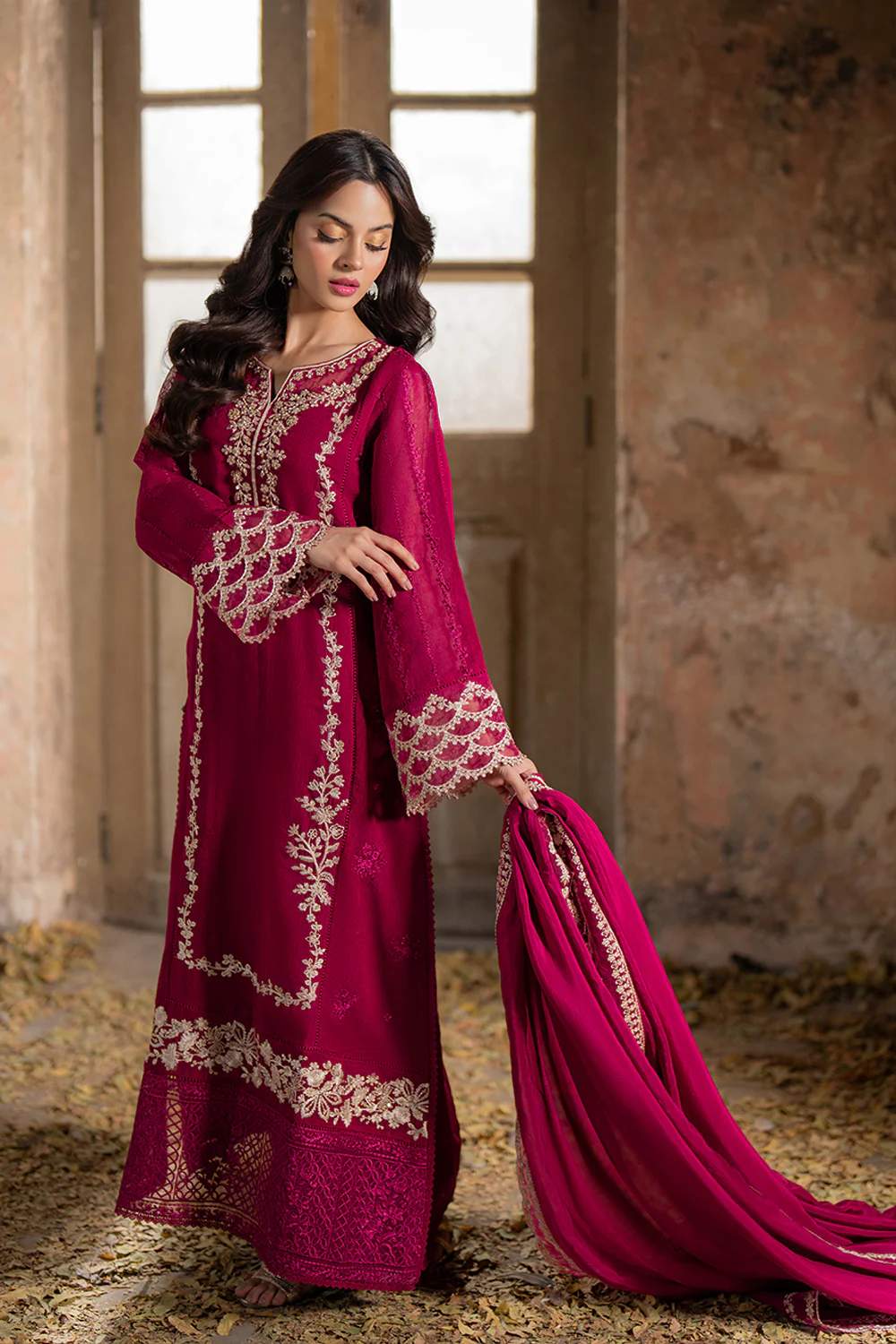 Introducing Vibrant Blaze from our Ensemble Collection. A bold and striking hot pink creation in khadi net, Vibrant Blaze features a luxurious Bamber silk dupatta and a hand-embellished patch on the front. This outfit combines vibrant energy with intricate craftsmanship, making it the perfect choice for a standout look at any special occasion.