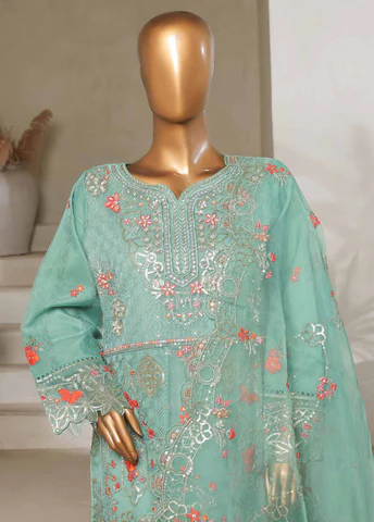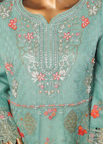 3 Piece Organza Turquoise Color Stitched Suit with Embroidered Shirt, Embroidered Dupatta & Raw Silk Trouser