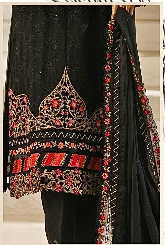 3 Piece Chiffon Black Color Stitched Suit with Embroidered Shirt, Embroidered Dupatta & Raw Silk Trouser