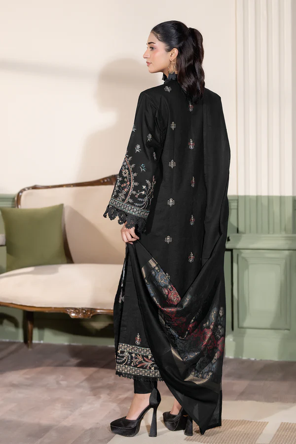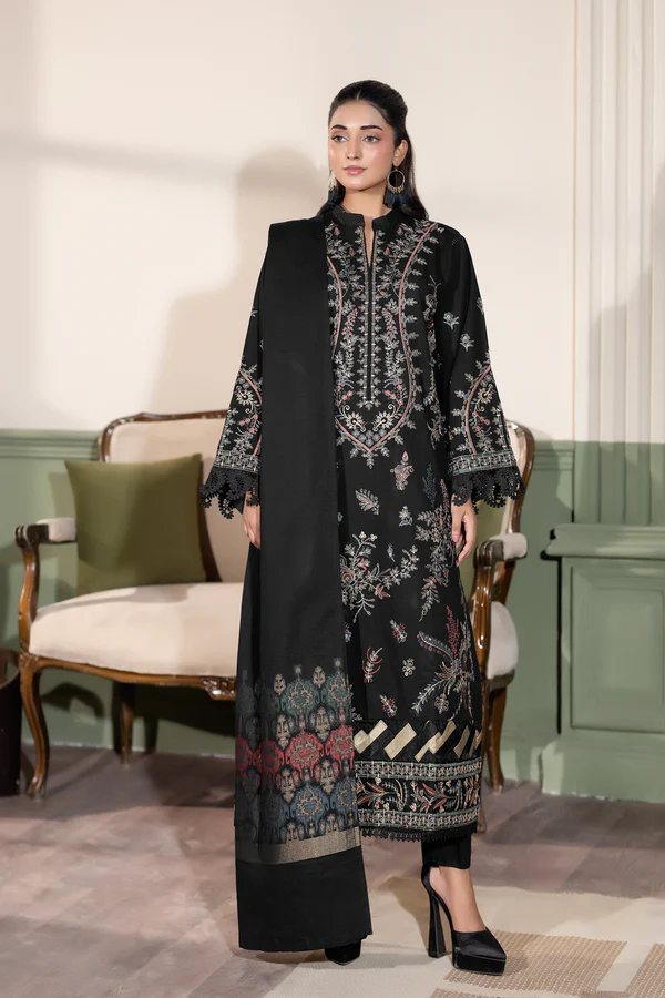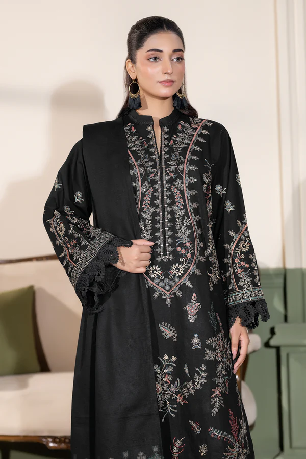 •Its base color is jet black, embellished with intricate multi-colored embroidery in shades of silver-grey, muted pink, subtle green, and soft beige.