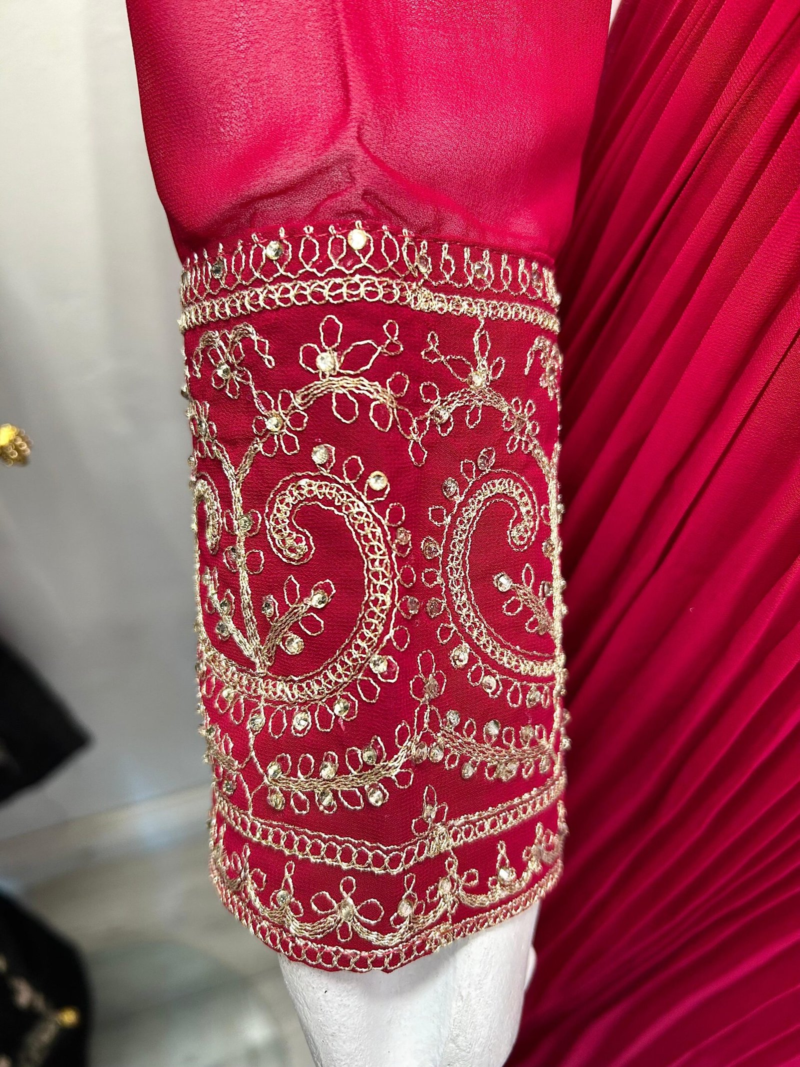 The sheer long sleeves are tastefully designed with ornate embroidered cuffs, adding a refined and elegant touch. The hemline is finished with complementary zari embroidery, perfectly balancing the overall look.