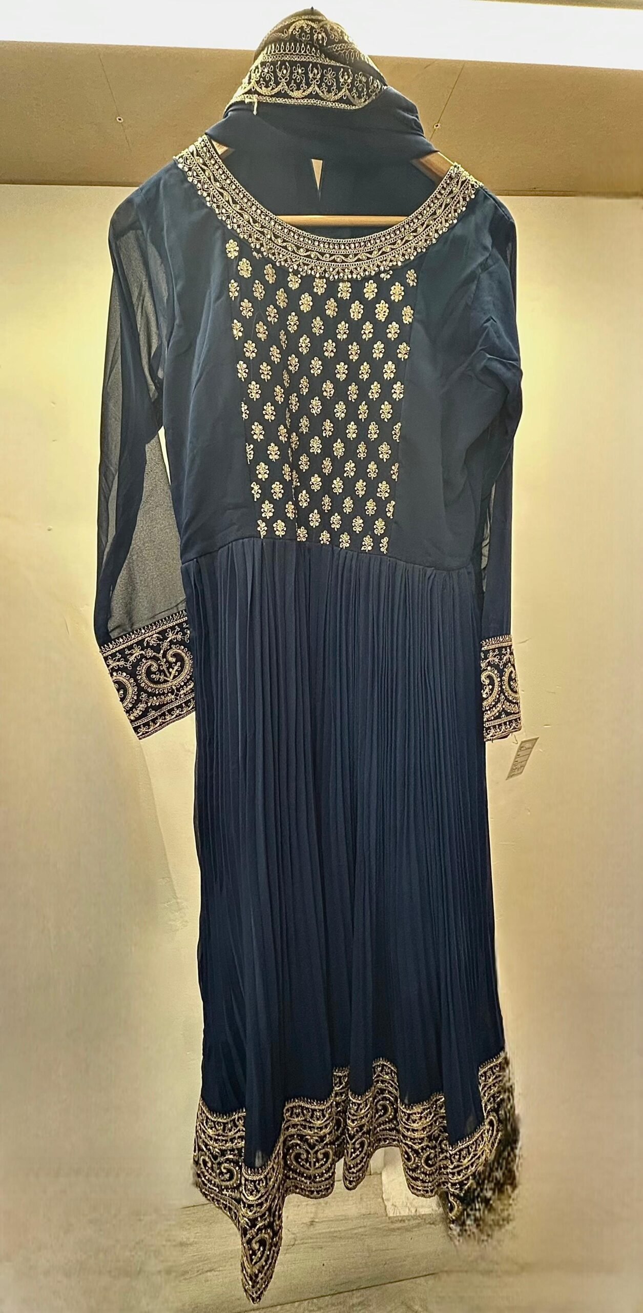 The Anarkali features a beautifully embroidered yoke adorned with intricate gold floral motifs, adding a rich and luxurious appeal. The neckline is delicately finished with detailed zari work, enhancing the overall sophistication of the outfit.