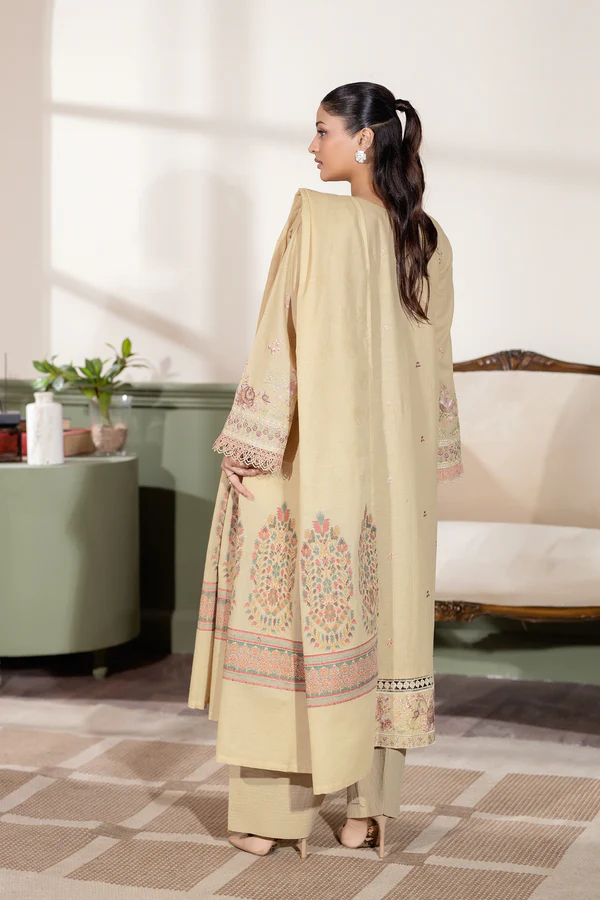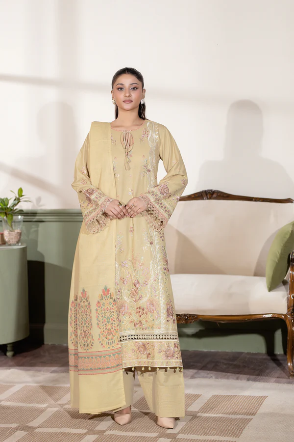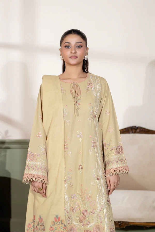 •Its base color is Dessert Ivory, embellished with intricate multi-colored embroidery in shades of silver-grey, muted pink, subtle green, and soft beige.
