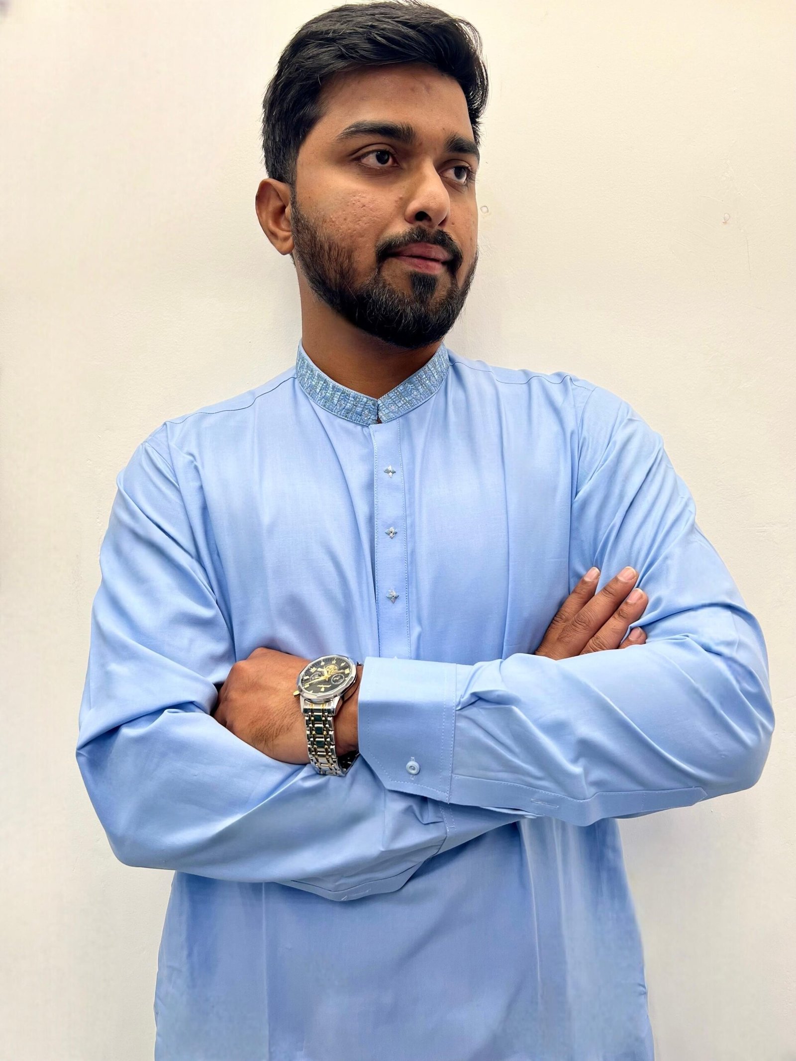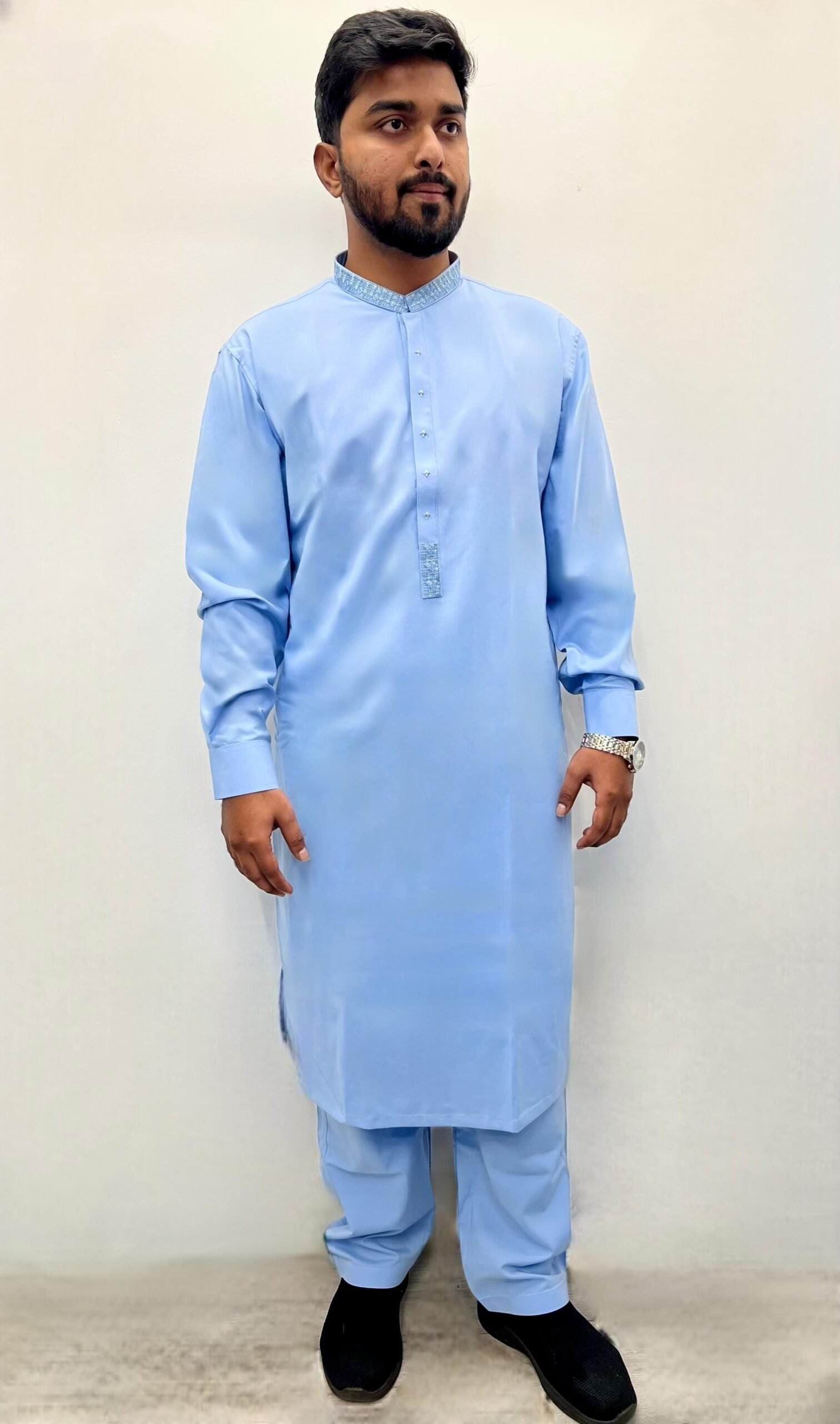 Experience the perfect fusion of tradition and contemporary style with this premium Men’s Aqua blue Shalwar Kameez Set. Designed with a sleek mandarin BAND, full sleeves accented with blue button closures, and two functional side pockets, this ensemble reflects exceptional craftsmanship and modern sophistication. Tailored for comfort, versatility, and distinction, it’s the ideal choice for any occasion.