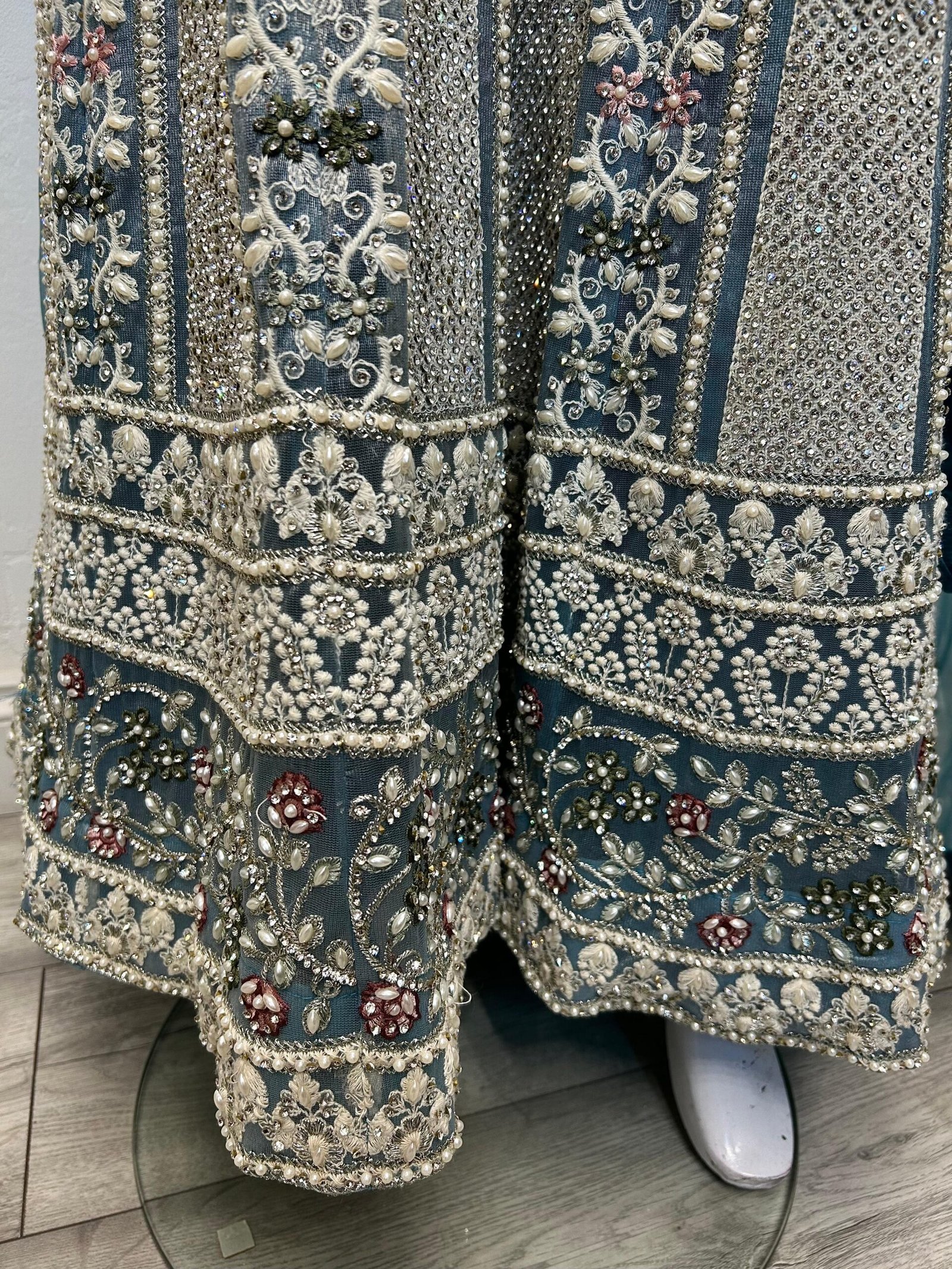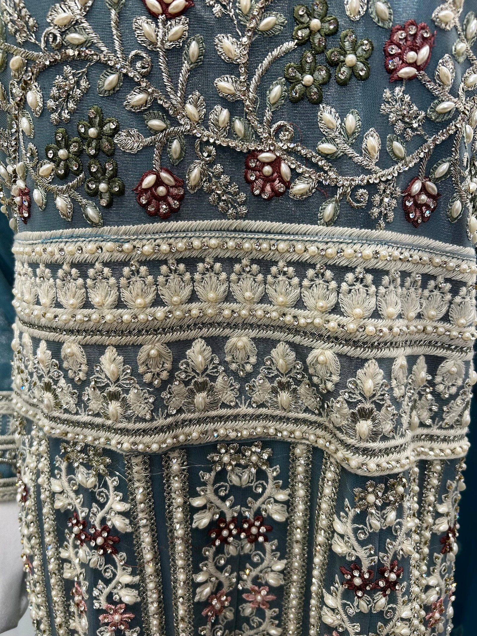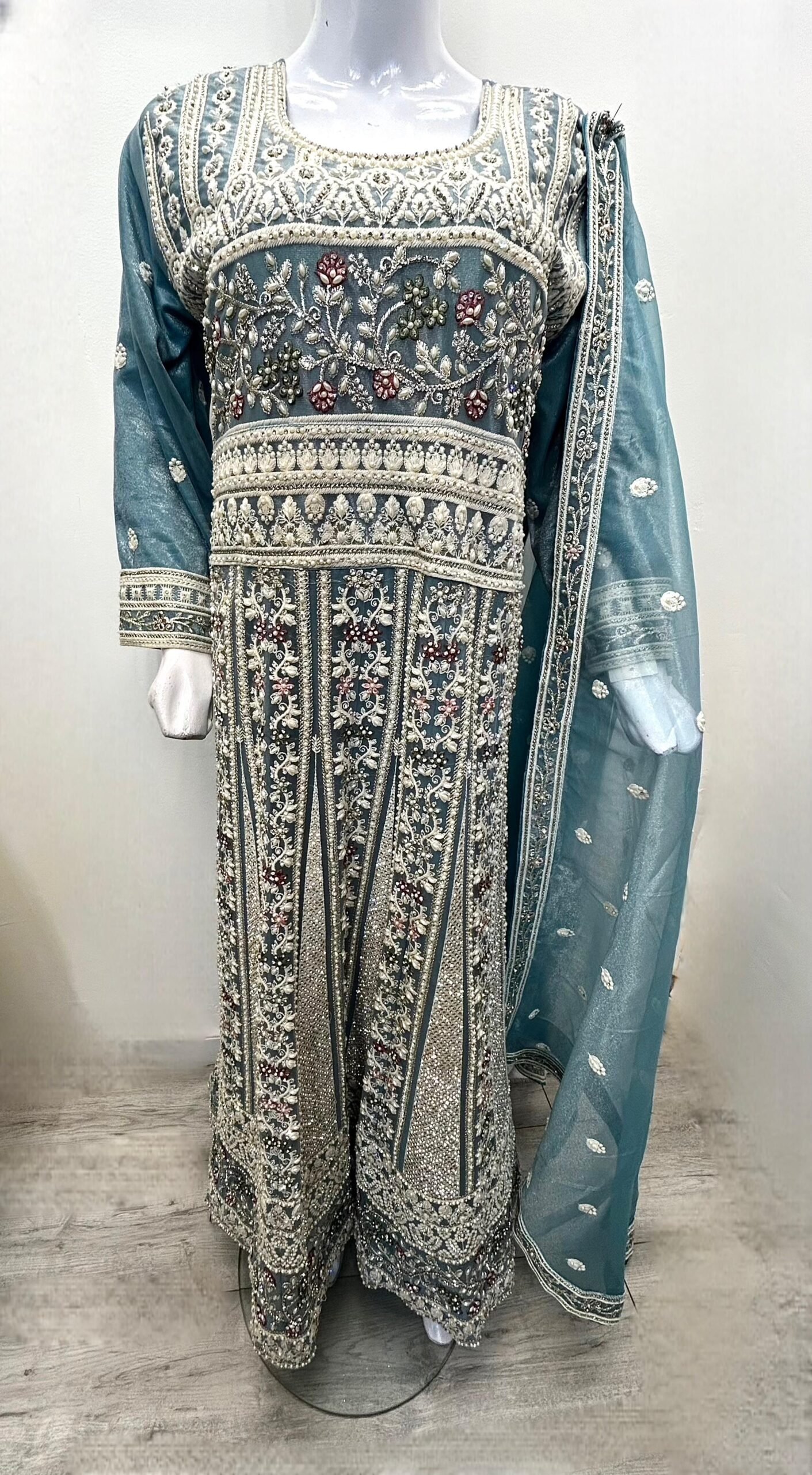 This is a full-length traditional formal dress designed in a beautiful teal/sea-Blue tone, enriched with intricate craftsmanship. The outfit consists of a heavily embroidered long kameez paired with a matching embroidered dupatta, ideal for weddings, festive occasions, and luxury events.