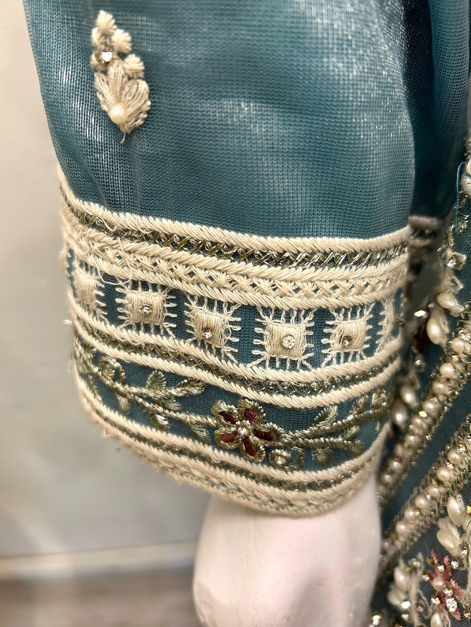 Full sleeves in matching teal fabric adorned with small embroidered motifs and finished with a detailed embroidered cuff.