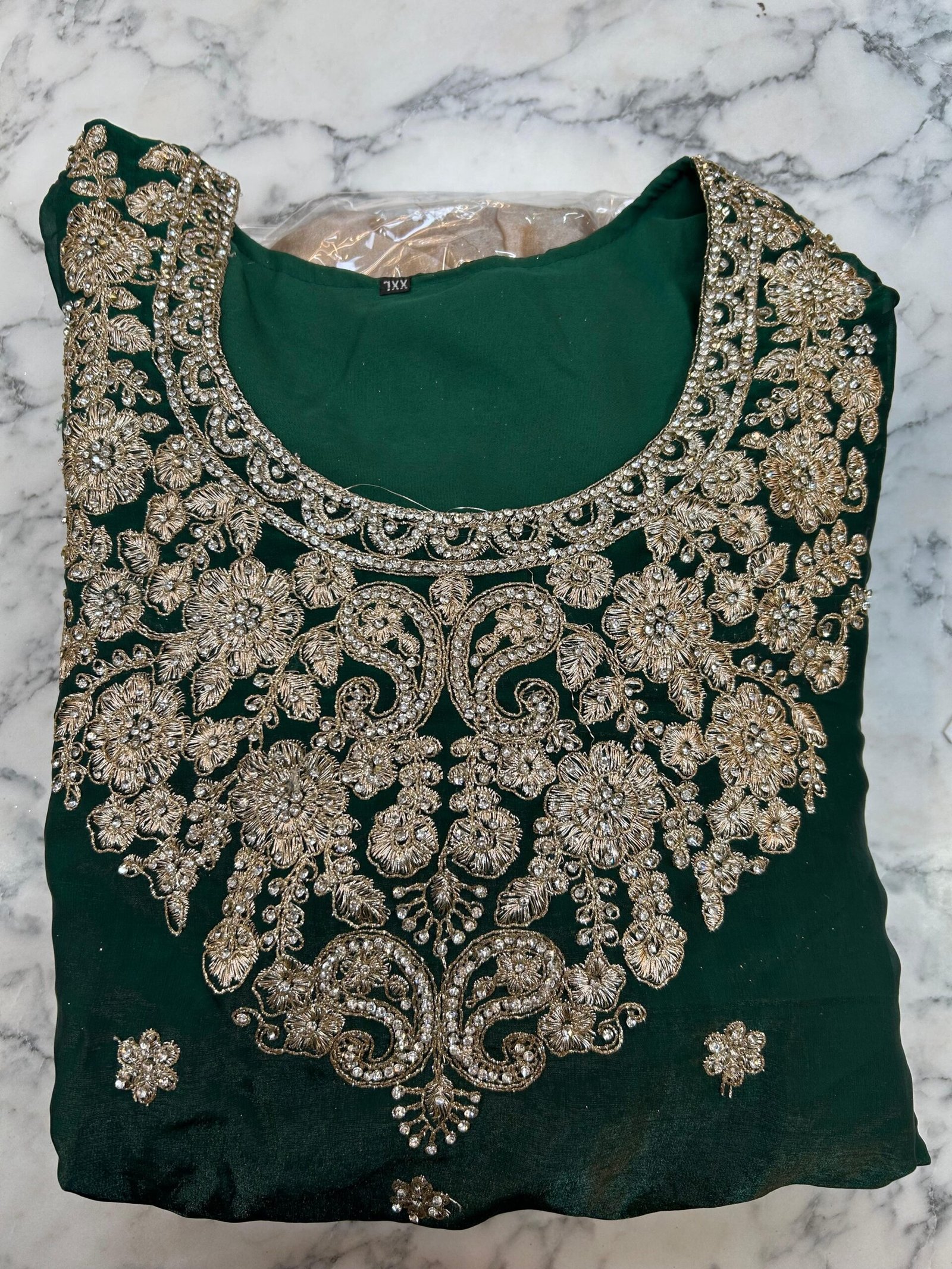 Crafted for women who adore luxury, this ensemble blends traditional artistry with modern refinement. The rich green fabric and exquisite gold embroidery come together to create a look that speaks of royalty, grace, and sophistication.