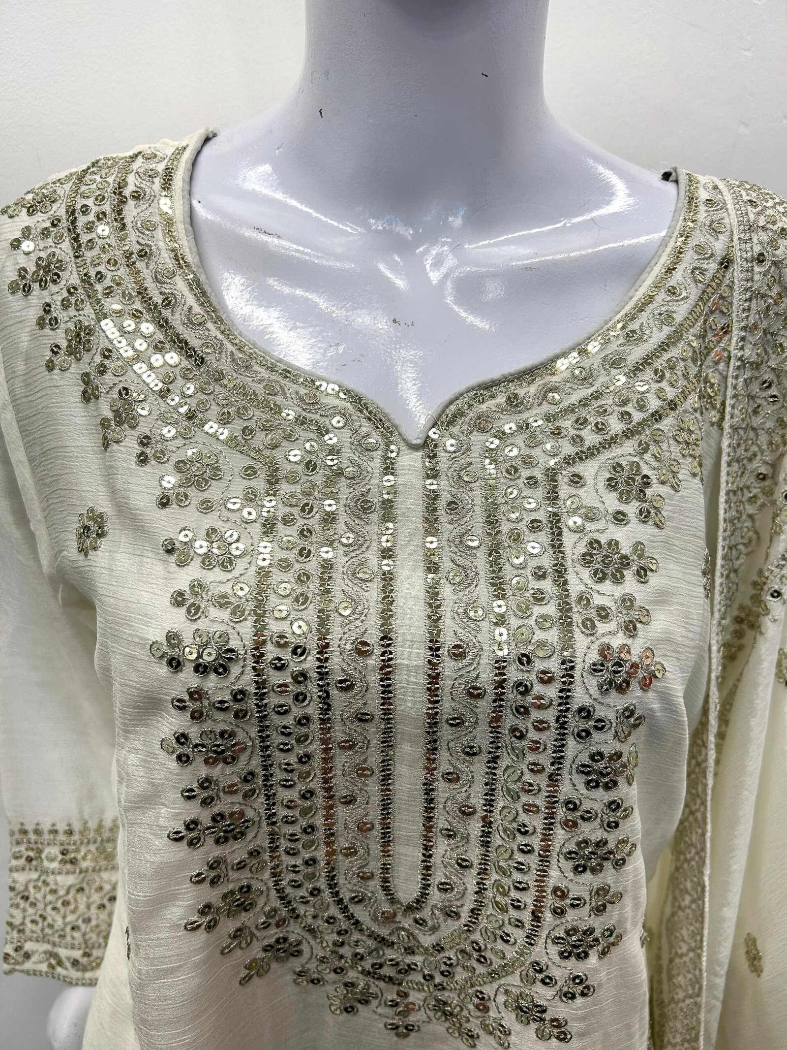 The dress in the image is a traditional three-piece outfit featuring a kurta, matching bottoms, and a dupatta. It is crafted in a rich OFF-WHITE fabric with a subtle sheen, giving it an elegant and luxurious appearance.
