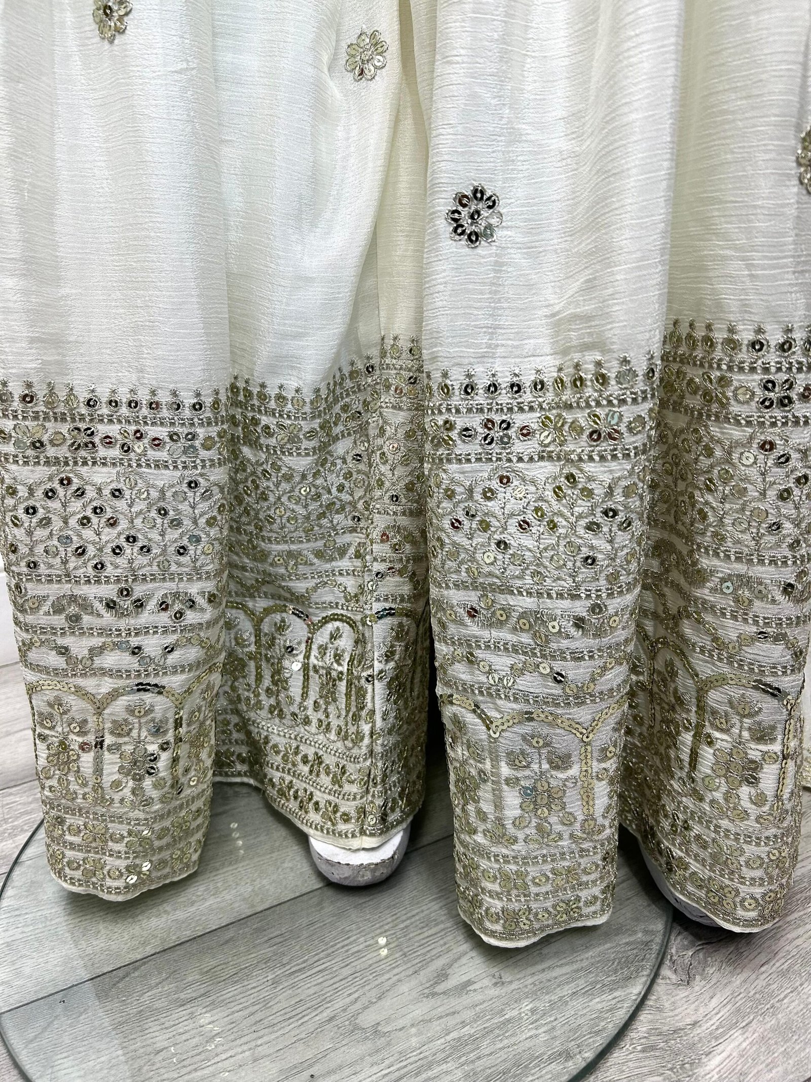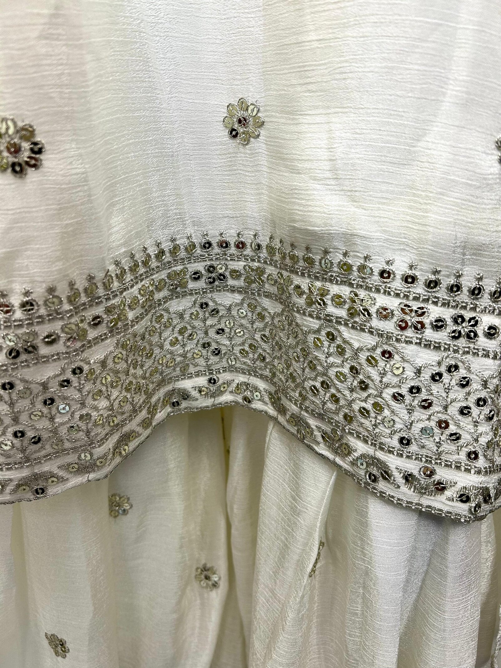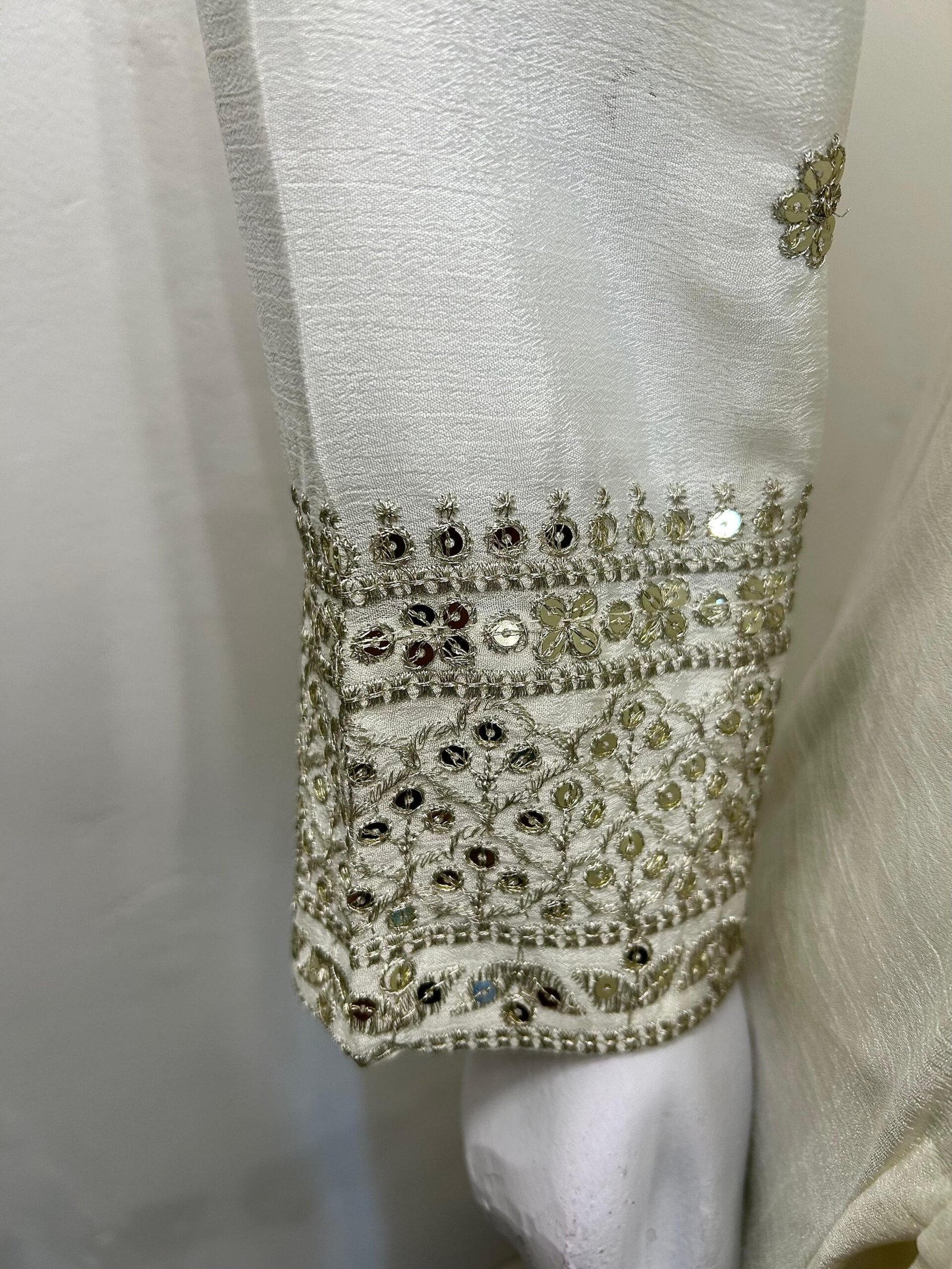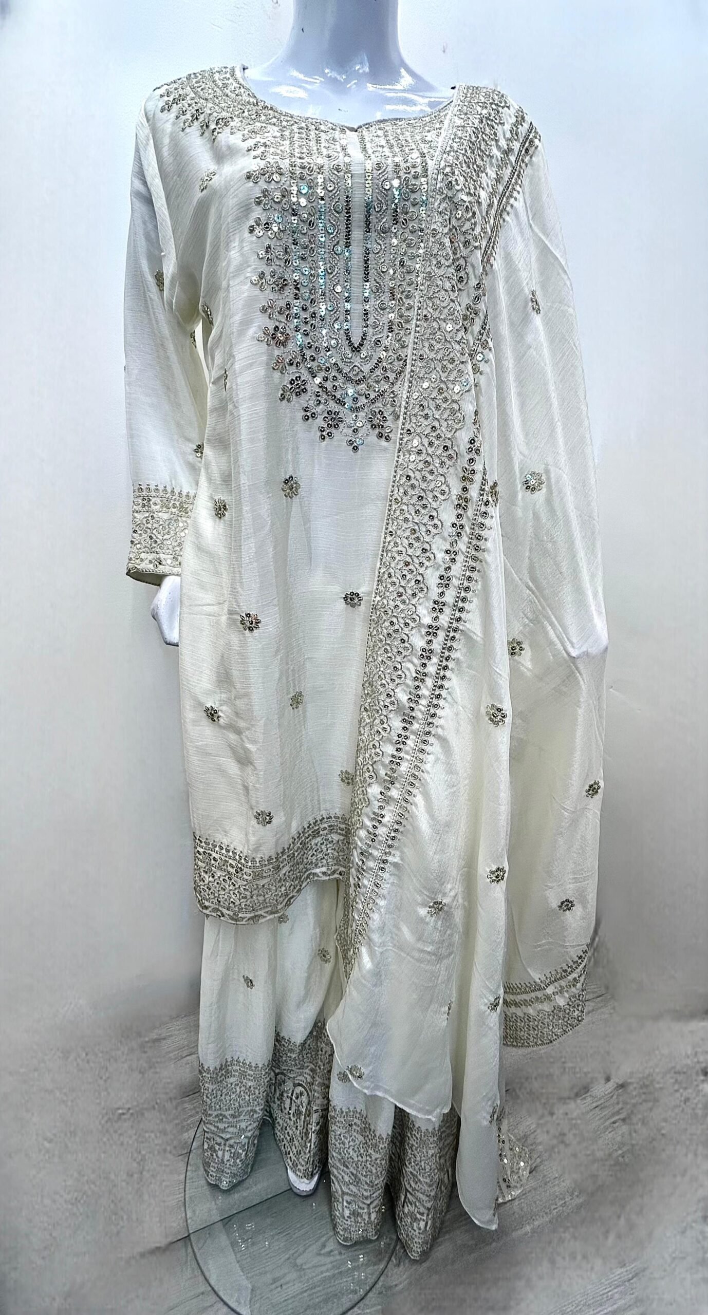 Step into timeless elegance with this luxurious three-piece outfit, crafted in a OFF-White fabric that beautifully contrasts with exquisite silver handwork embroidery. The long kurta features a richly detailed neckline adorned with intricate floral motifs that cascade gracefully down the front, creating a silhouette that is both refined and flattering.