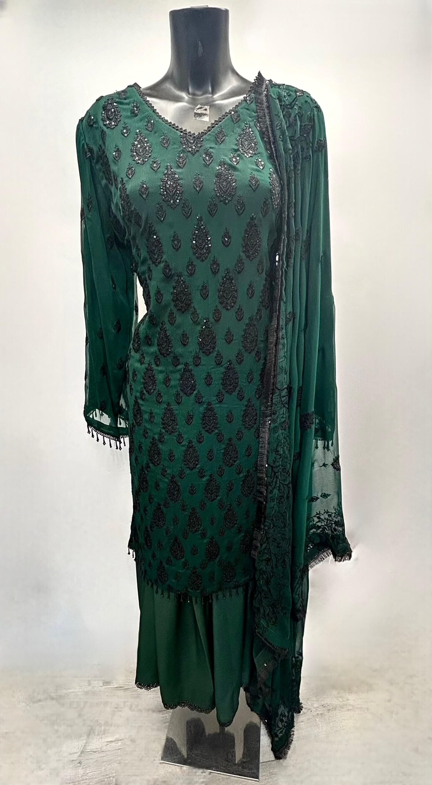 This graceful traditional ensemble is designed in a rich emerald green shade, offering a perfect blend of sophistication and timeless beauty. The shirt (kameez) is crafted from lightweight chiffon and features intricate all-over embroidery in a classic paisley motif, delicately embellished with fine threadwork, sequins, and subtle bead detailing that adds a soft shimmer to the outfit.