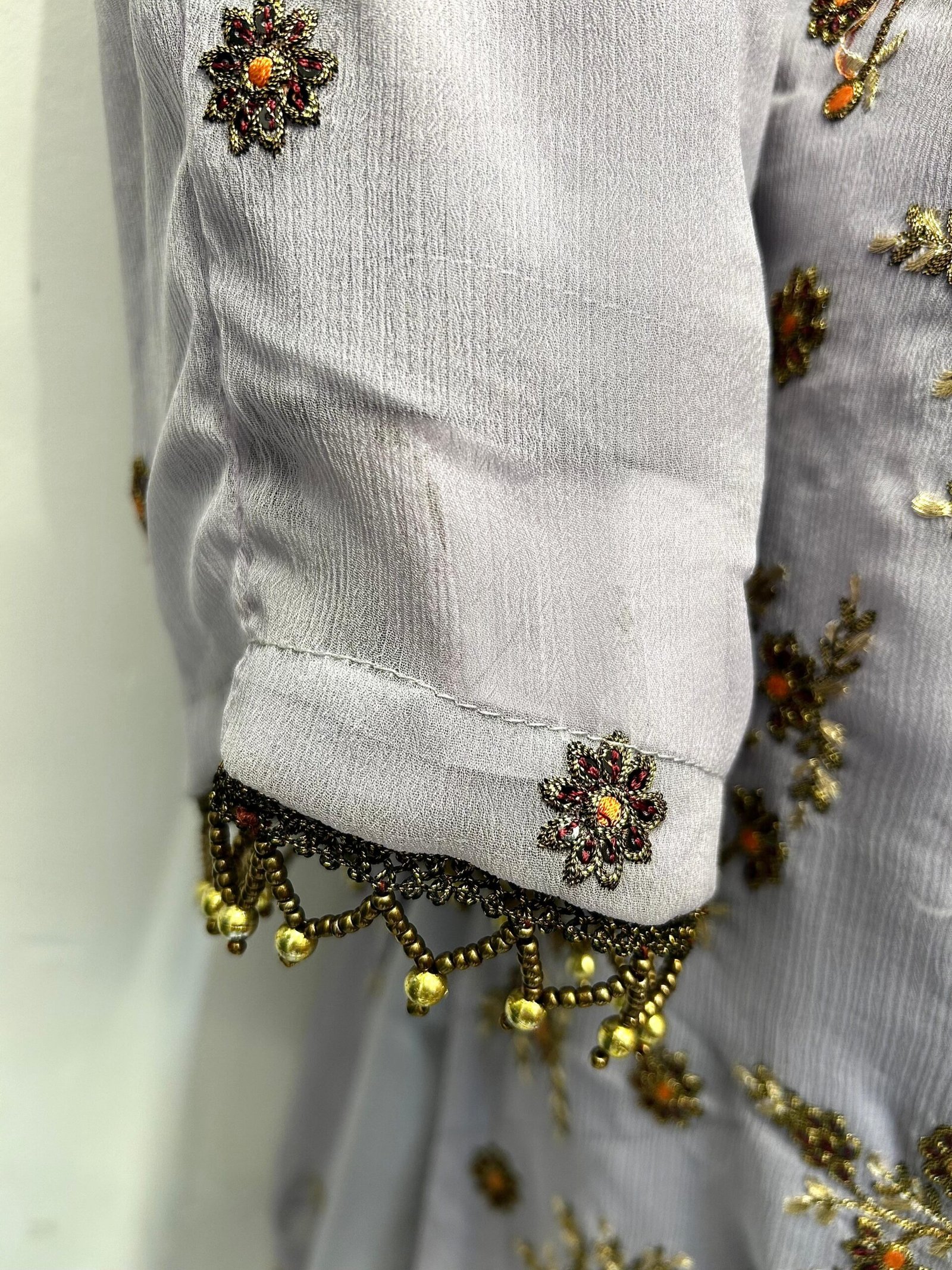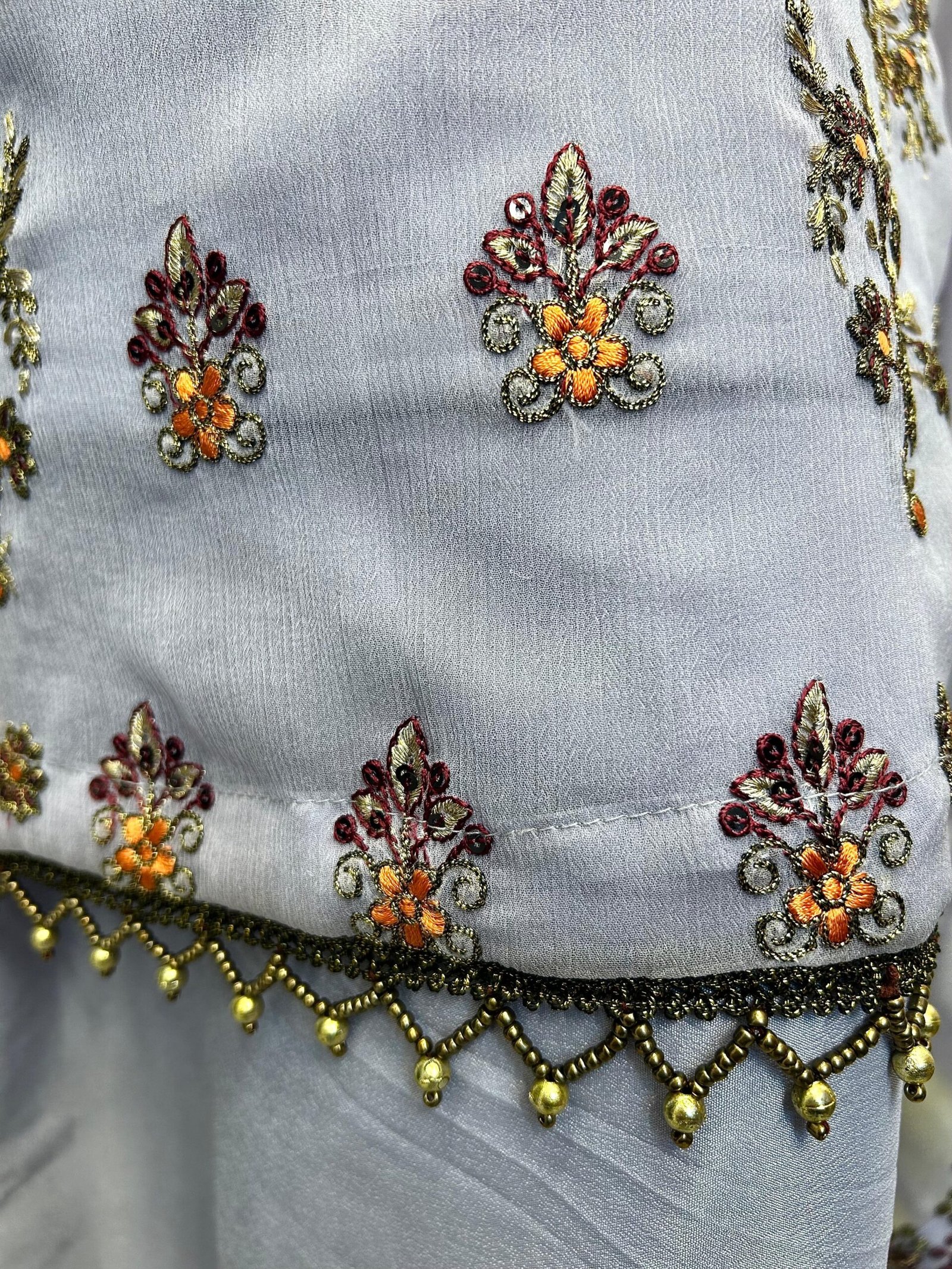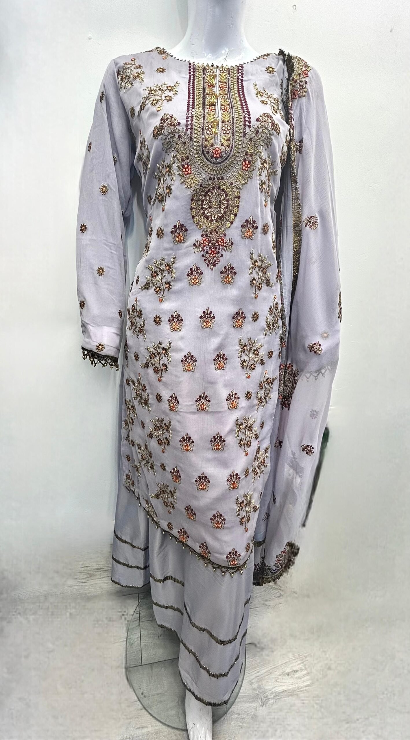 This stunning traditional outfit is crafted in a soft, pastel grey base, exuding elegance and timeless charm. The shirt (kameez) features intricate all-over embroidery with floral and paisley motifs, beautifully embellished using fine threadwork, sequins, and bead detailing. The neckline is richly adorned with heavy embroidery in complementary gold, maroon, and peach tones, creating a striking focal point that enhances the overall look.