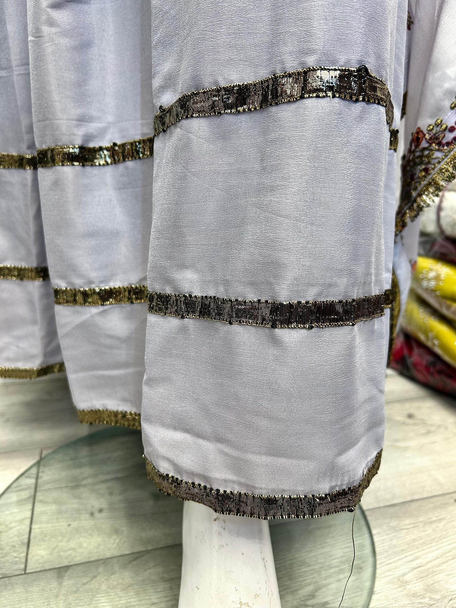 •Trouser: Matching fabric with embellishment