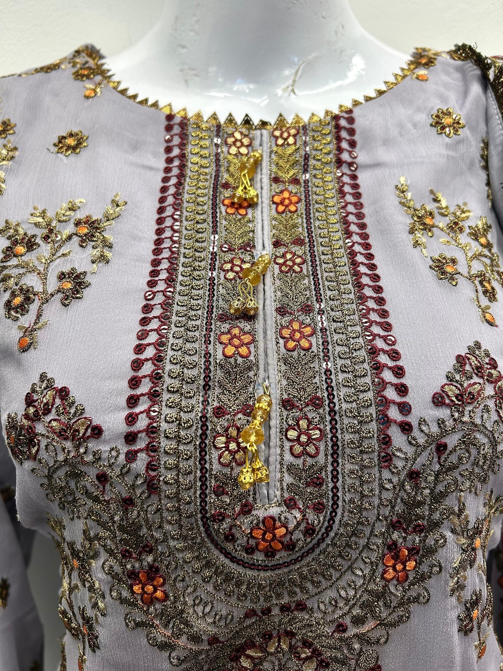 •Neckline: Heavily embroidered embellished neckline