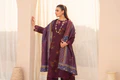 Deep plum tones enhanced with embroidered patches and lace textures. The printed wool shawl ties the outfit together with elegance and comfort.