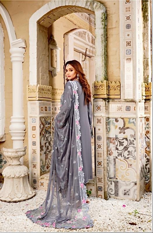 Step into refined elegance with this enchanting charcoal grey ensemble—an exquisite fusion of delicate pink florals and luxurious handcrafted details. The richly embroidered kameez dazzles with pastel artistry, while the lace-trimmed dupatta drapes beautifully, adding a soft romantic glow. Paired with finely detailed trousers, this outfit captures timeless beauty and modern sophistication, making it perfect for festive evenings, wedding events, or any moment where you want to shine with effortless grace.