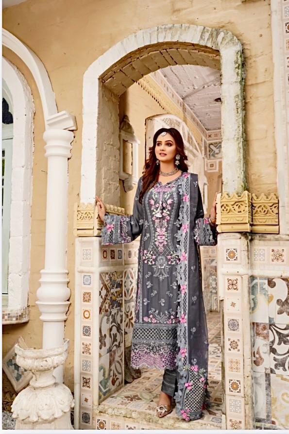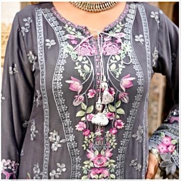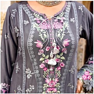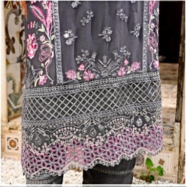 •The kameez is designed in a deep grey base, beautifully contrasted with embroidery in pink, lavender, white, and silver threads.