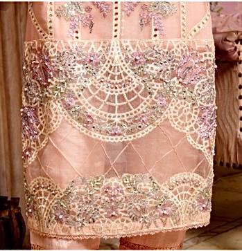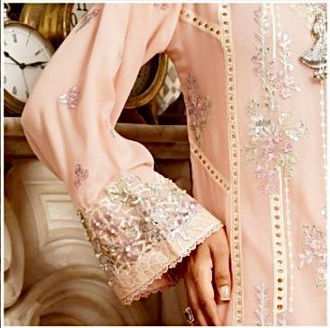 •The kameez features a delicate pastel pink base, adorned with floral embroidery, sequins, crystal accents, and threadwork in hints of silver, white, and soft pastels.