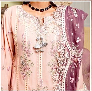 Embrace soft elegance with this dreamy blush pink ensemble—a perfect harmony of romance, luxury, and refined craftsmanship. The delicately embroidered kameez sparkles with florals, sequins, and graceful patterns, while the rich mauve dupatta cascades beautifully with its ornate lace borders and intricate artistry. Paired with understated trousers and statement accessories, this outfit radiates timeless charm and feminine sophistication. Ideal for festive celebrations, evening soirées, and moments that call for effortless glamour.