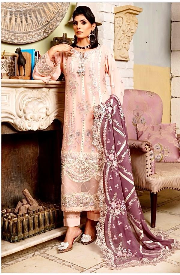 The woman is wearing a beautifully feminine blush pink traditional ensemble, designed with intricate embellishments and soft romantic tones. The outfit consists of an embroidered kameez, matching trousers, and a striking contrasting dupatta in a deep mauve shade.