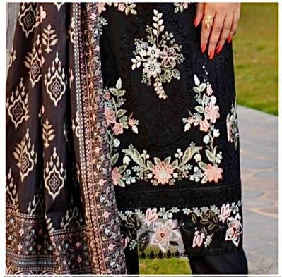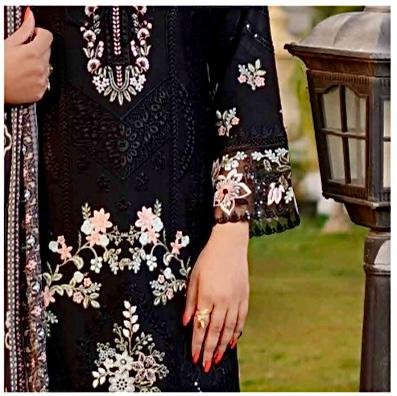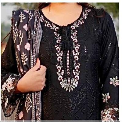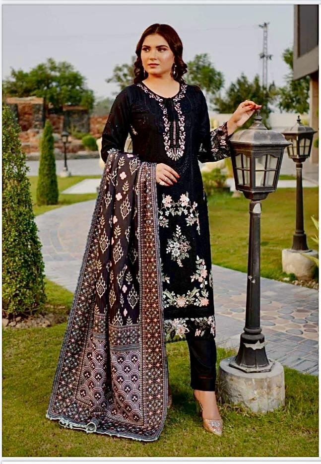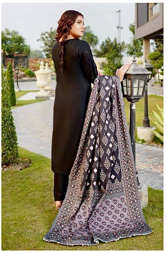Make a bold and elegant statement with this exquisite black embroidered ensemble—a timeless classic crafted for the modern woman. Adorned with delicate floral threadwork and complemented by a beautifully designed printed dupatta, this outfit blends sophistication with cultural charm. Its graceful silhouette, intricate detailing, and versatile black palette make it the perfect choice for evening gatherings, festive celebrations, and formal occasions.