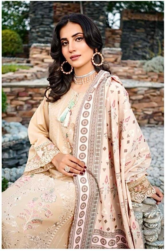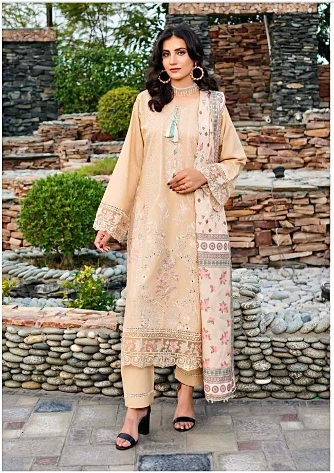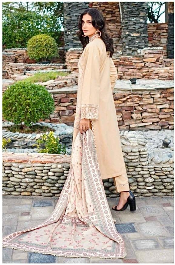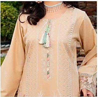 Soft, serene, and effortlessly elegant—this peach-beige embroidered ensemble is the perfect blend of sophistication and feminine charm. Intricately adorned with pastel florals, cutwork detailing, and delicately finished borders, the outfit exudes a gentle luxury that is both timeless and captivating. Paired with a beautifully printed dupatta and tailored trousers, this look is ideal for daytime festivities, intimate gatherings, and refined celebrations.