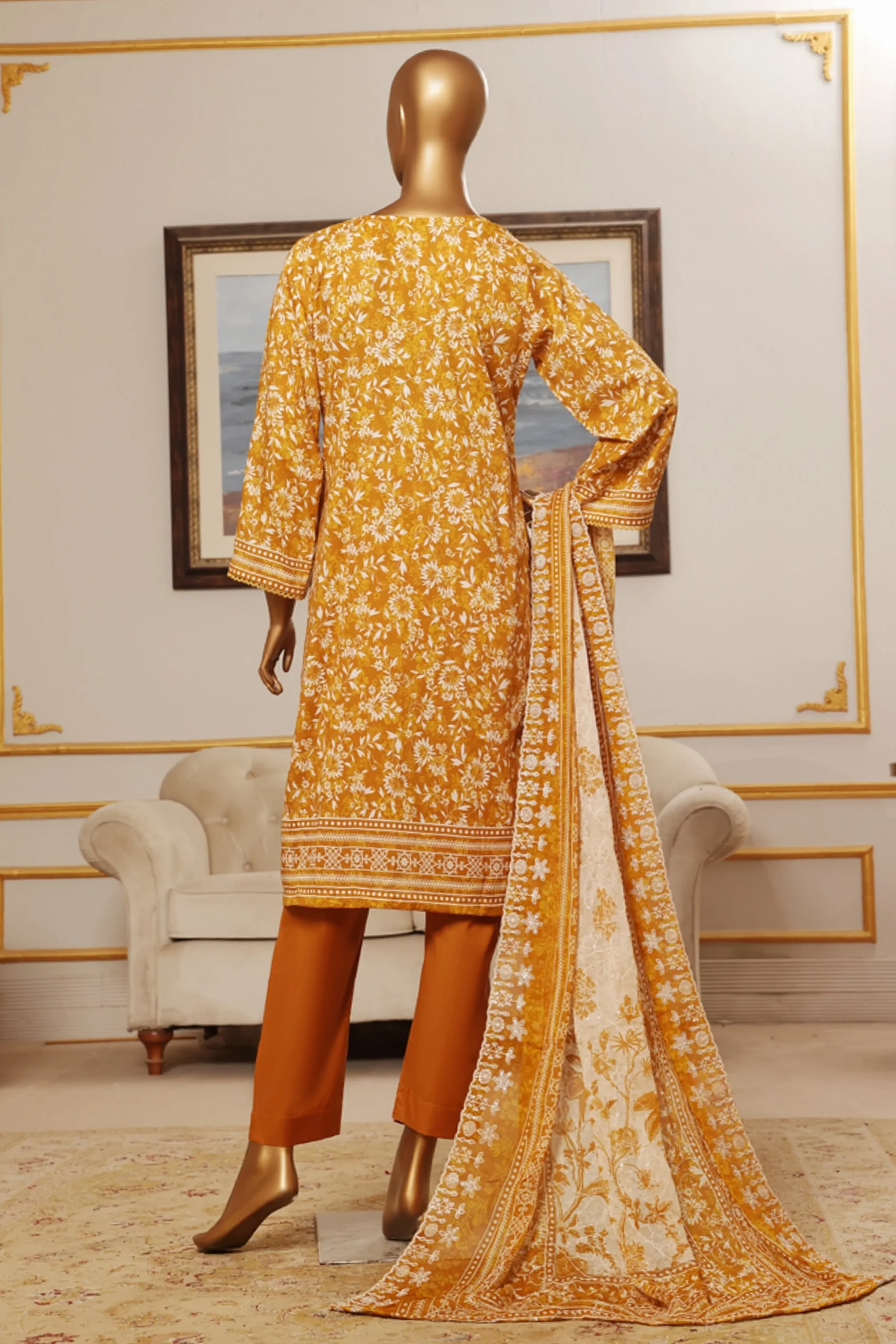 Refresh your ethnic collection with this elegant mustard kurta set, designed for effortless style and comfort. The kurta features an all-over floral print complemented by delicate embroidery, with a beautifully detailed cutwork pattern along the hem that adds a refined, handcrafted touch. The classic V-neckline and three-quarter sleeves with coordinated borders enhance its timeless appeal.