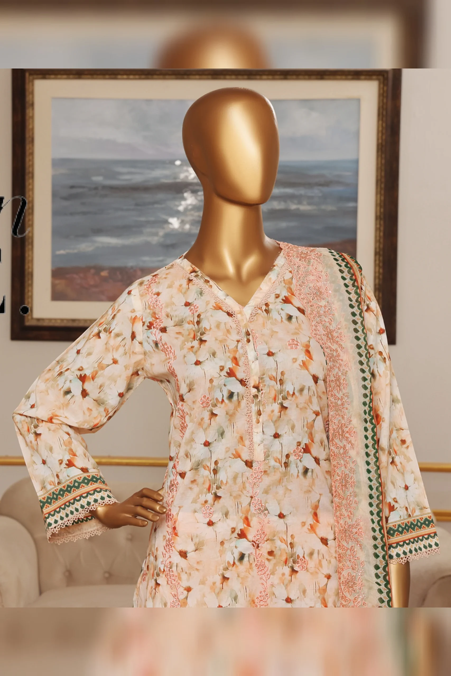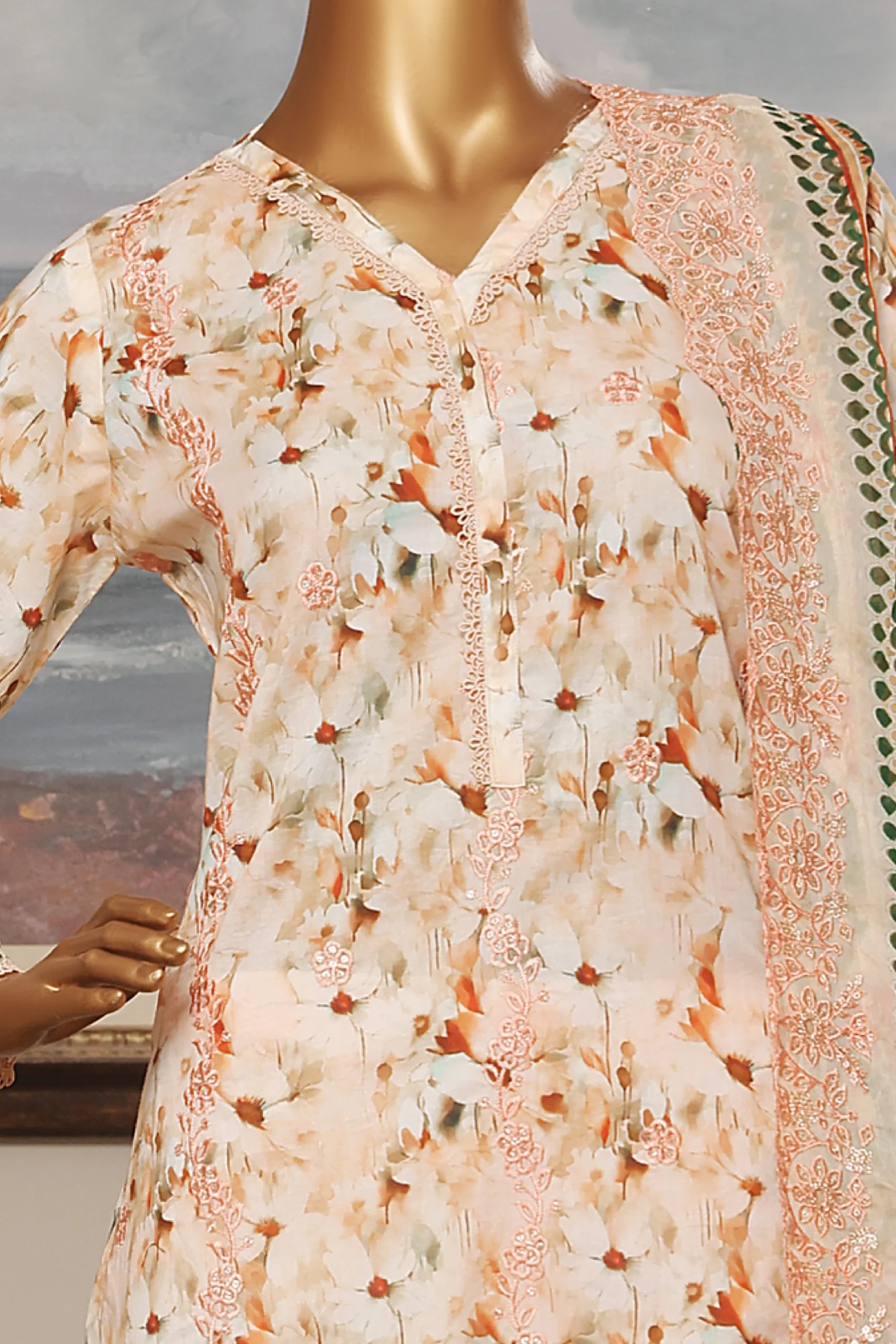 Shirt: Crafted from premium lawn fabric, the shirt features intricate digital prints and delicate embroidery with sequence work on the neckline, sleeves, and border. The primary color is a light peach/fawn with multi-color floral patterns.